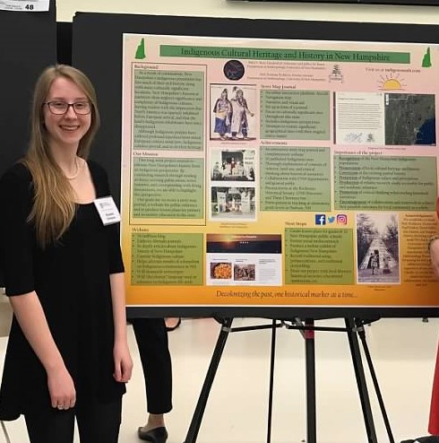 Emily Olivier, French Studies and Education Studies Dual Major, Women’s Studies Minor, Social Justice Leadership Minor: Emily joined INHCC as an intern in Fall 2018. She has a vital passion for Education and was able to accomplish publishing K-12 education plans as resources aimed at integrating Indigenous heritage and recognition into New Hampshire schools. Emily has also presented at conferences and historical societies on her work and the work of INHCC! Emily will go on to complete graduate studies at UNH..