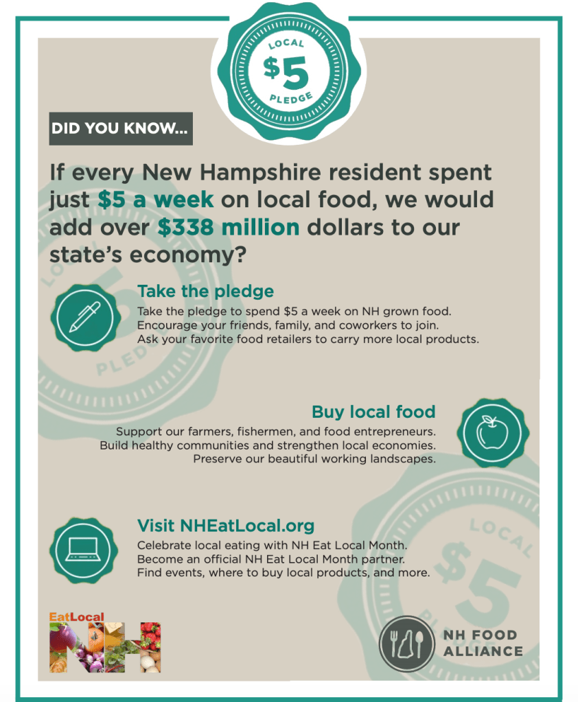 Promotion of this year’s NH Eats Local Month is in collaboration with the NH Food Alliance, the New Hampshire Department of Agriculture, Markets & Food, Seacoast Eat Local, and the Monadnock Food Co-op.