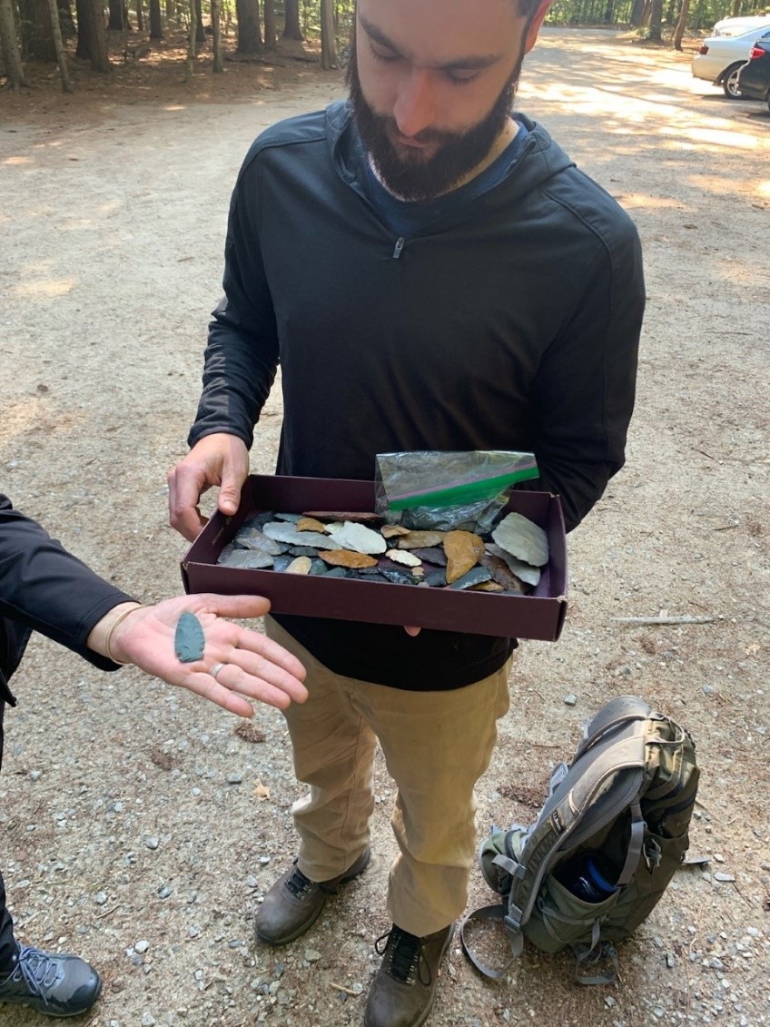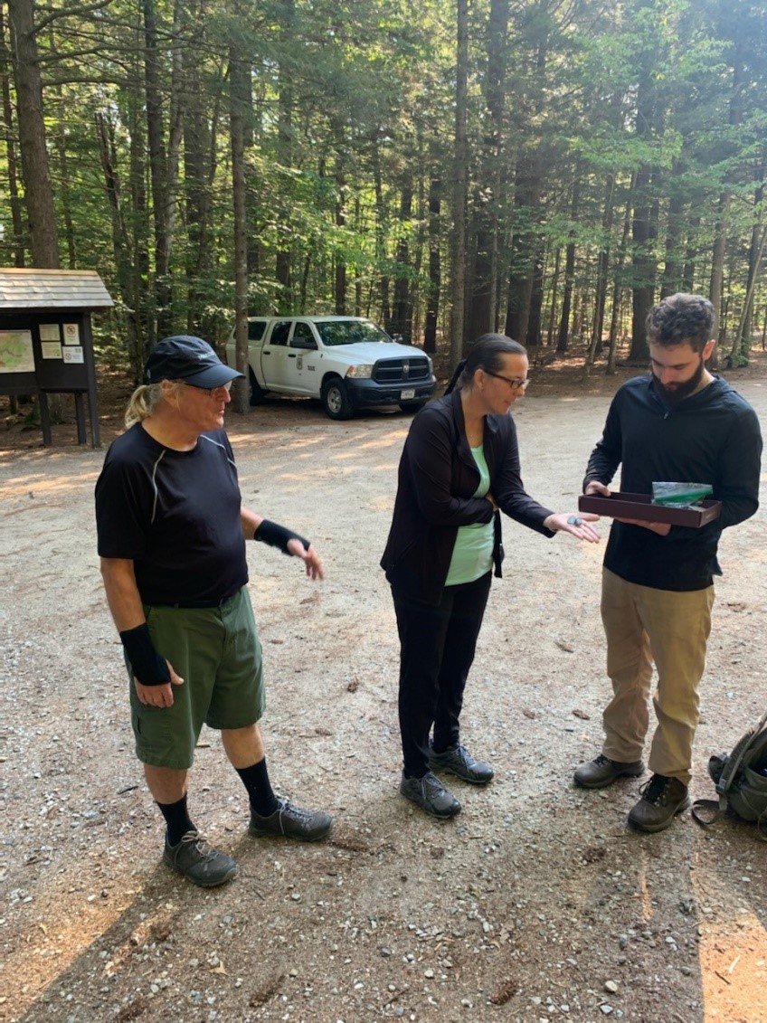 A preliminary field visit to one of the sites occurred in Sept 2021. Members of the INHCC and WMNF fire and botany staff visited South Moat mountain to look at some representative stands. Members included Paul Pouliot, Sag8mo and Tribal Historic Preservation Officer, Cowasuck Band of the Pennacook-Abenaki People; Denise Pouliot, Sag8moskwa and Artist, Cowasuck Band of the Pennacook-Abenaki People; Dr. Meghan C.L. Howey, Professor, Anthropology & Earth Systems Research Center UNH and her former student Emily Mierswa; Jeffrey Baron and Hunter Stetz, Independent Archaeological Consulting Field Technicians; Erica Duda WMNF Botany Technician, and John Neely WMNF Zone Assistant Fire Management Officer. The morning began with introductions and a brief description of the known history of the area by John Neely. Then Jeff Baron showed some examples of stone tools he has created from different representative lithic materials.